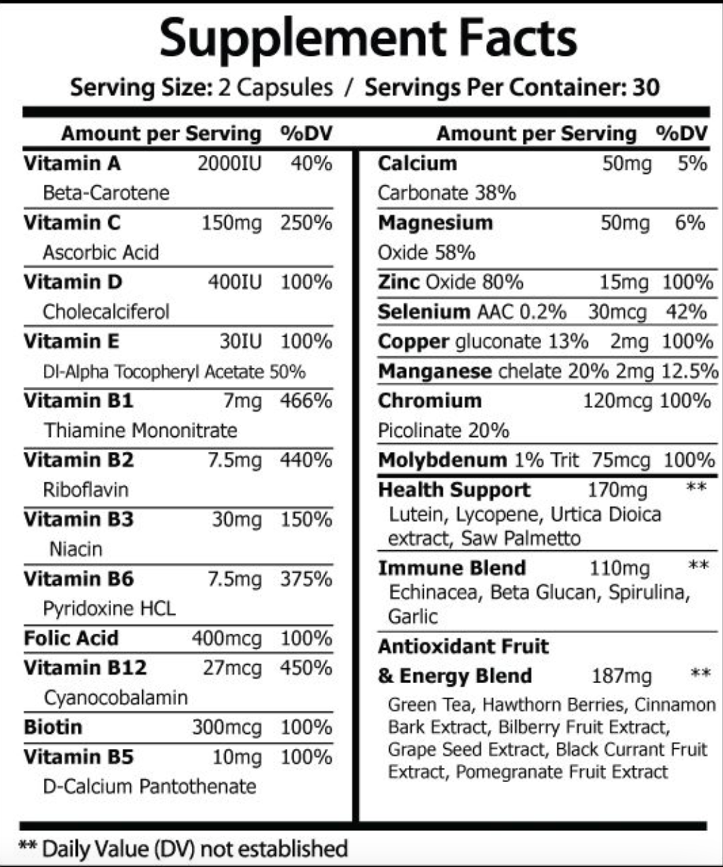 Packed with essential vitamins and minerals to support women's health, plus organic fruits and vegetables for whole food nutrition and antioxidant support, all in just one daily multivitamin for women.  Boost your natural energy and vitality and support your heart, brain, eye, and immune health with vitamins, minerals and organic whole foods to round out your diet and help keep your body functioning at its best.Badges